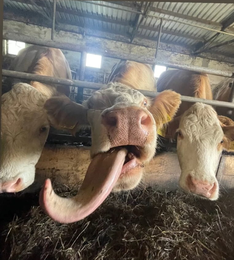 Na naší rodinné farmě chováme deset krav plemene masný Simentál a dvě mléčné plemene Čestr. V letošním roce bychom měli mít naše první telata, doufáme ,že se nic nestane a že tomu tak bude. Přes zimu jsou krávy ustájeny v našem chlévu, kde se krmí senem a jetelotravní senáží. Jakmile je venku teplo a pěkně, krávy se pasou na deseti hektarech trávy okolo chléva.